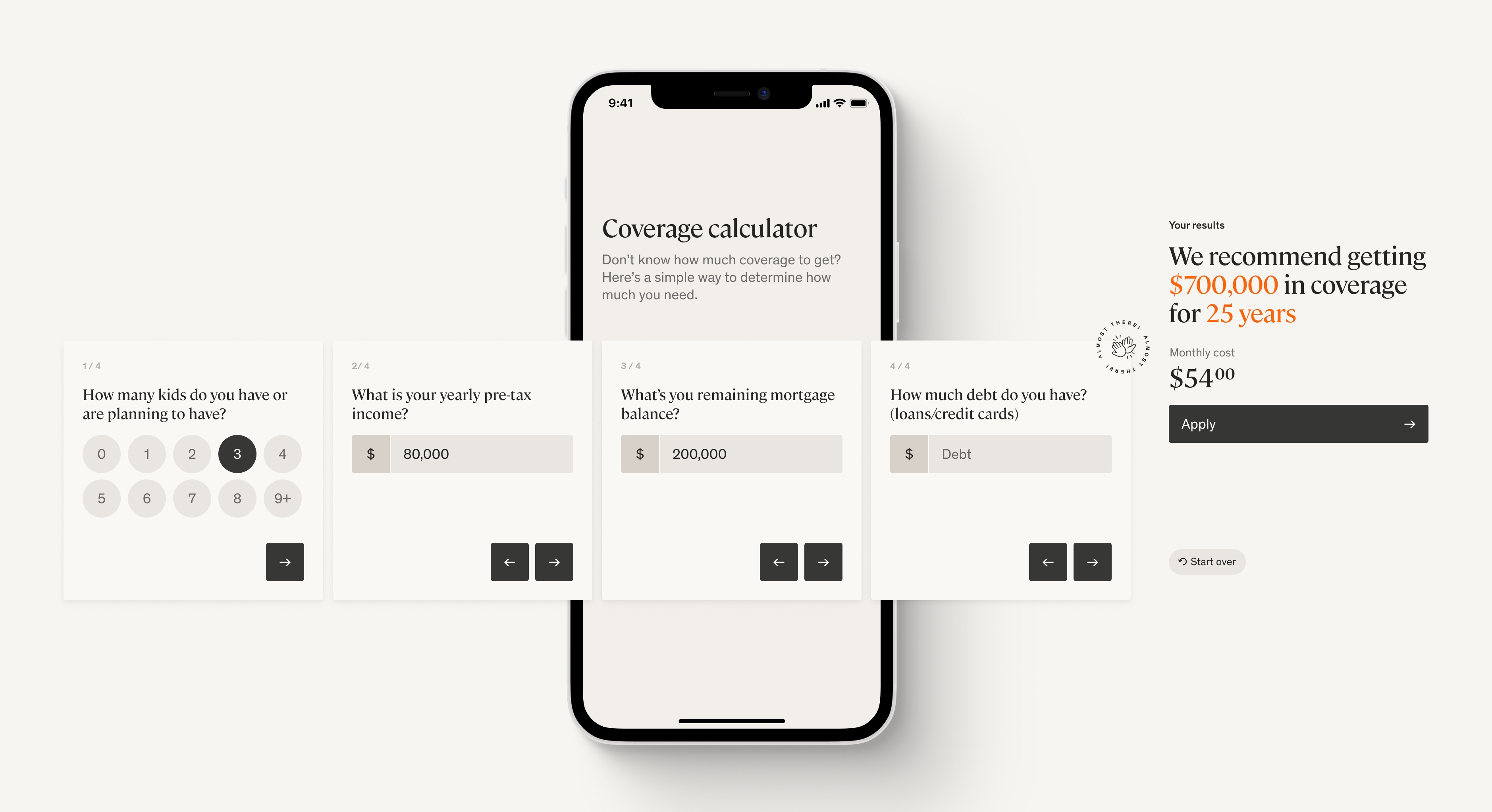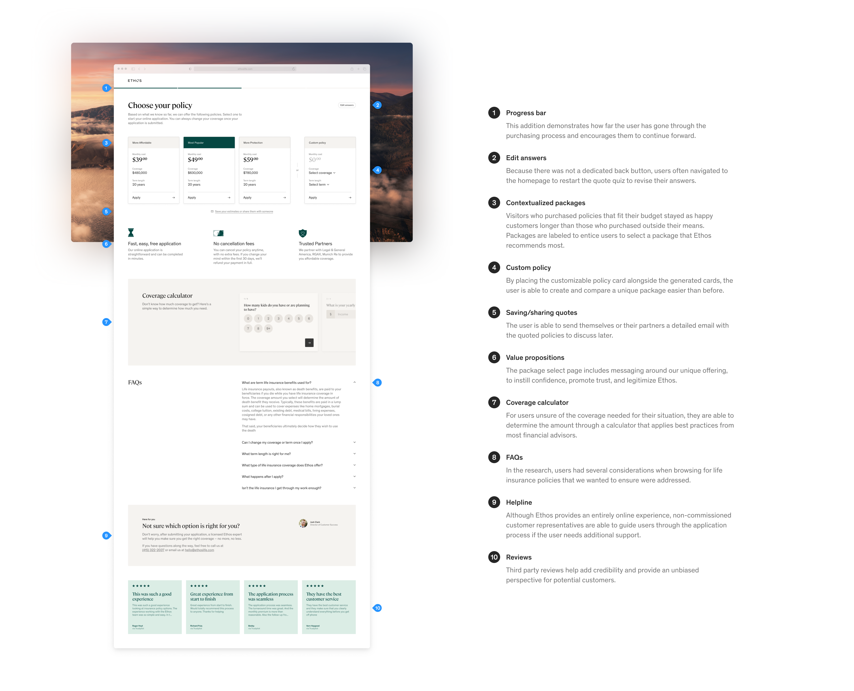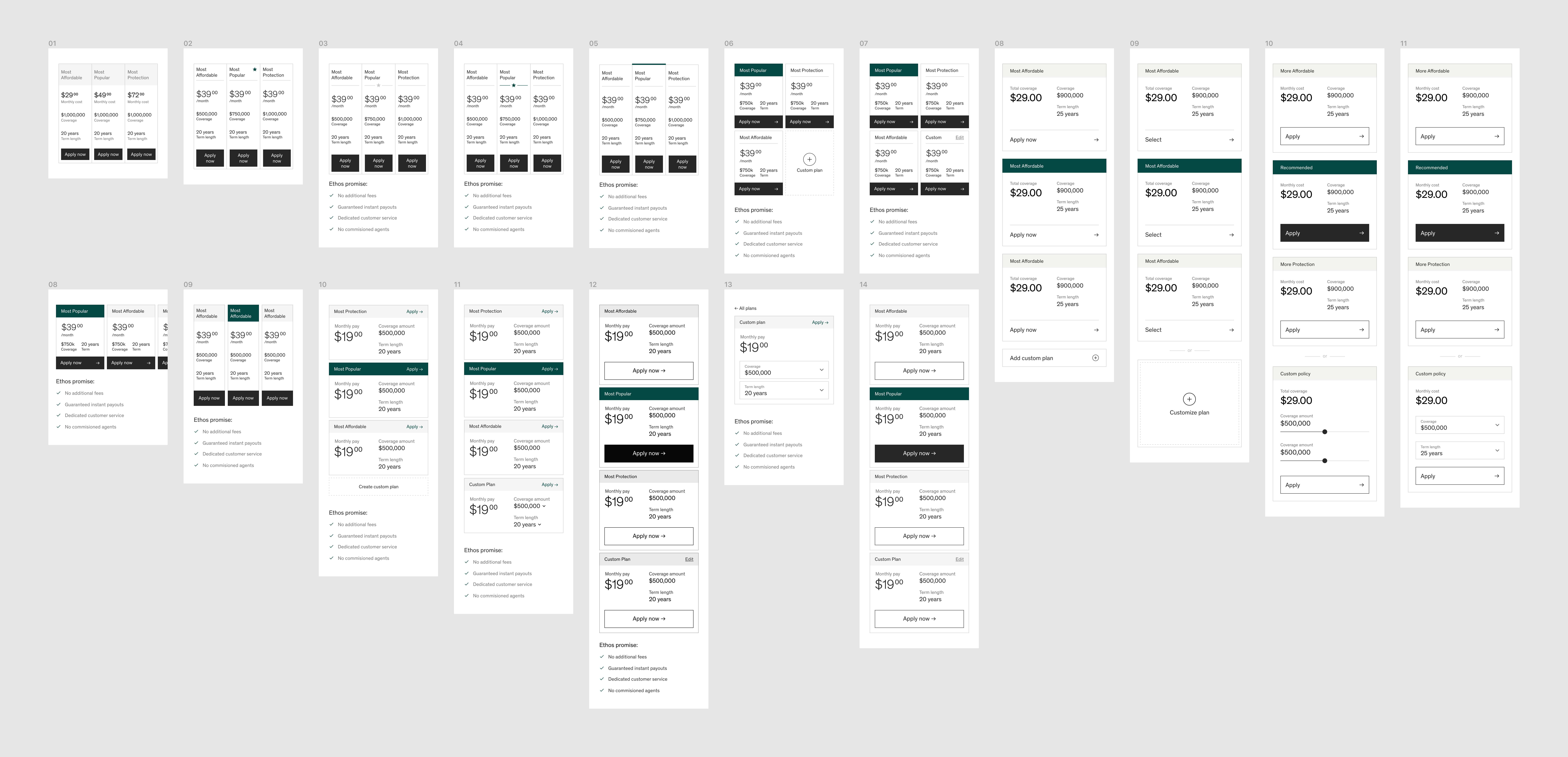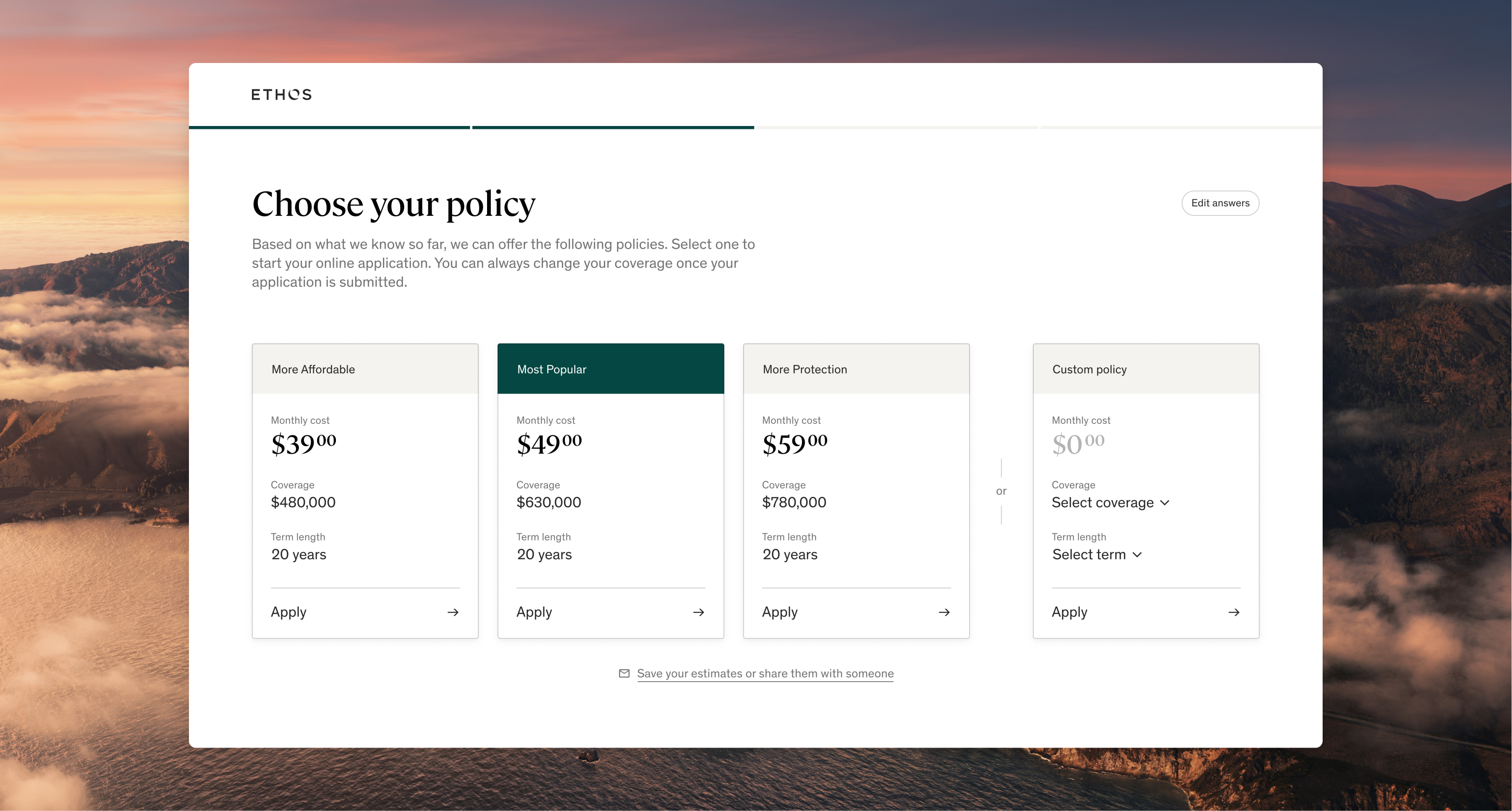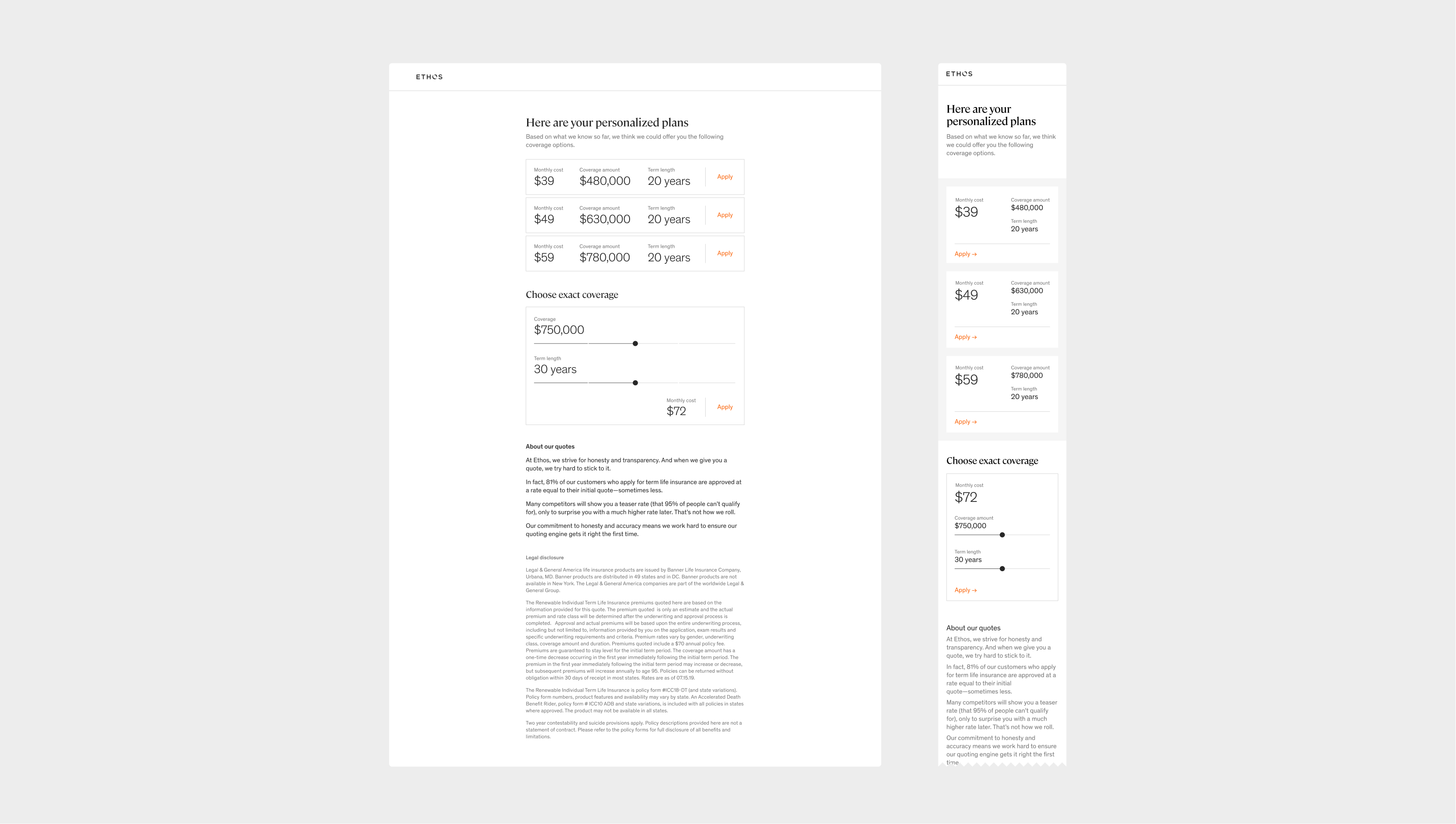 Ethos is a modern life insurance company that prides itself on offering a fully online experience with no medical exams or pushy salespeople. A key inflection point of the Ethos user journey is when a user must select a life insurance package to initiate their application. In order to understand how much an Ethos life insurance policy would cost, prospective customers are asked to fill out a short questionnaire. Based off of their answers, potential packages are presented with variations in term length, coverage, and monthly premiums.