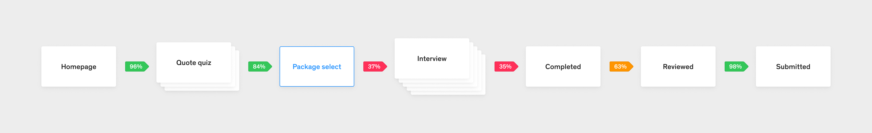 Converting at 37%, the package select page was by far the largest drop-off point in our funnel. Therefore, our goal for this project was to make a step function improvement in conversion and ultimately grow application submissions. In order to effectively address the core issues, we decided to investigate the low conversion numbers from a holistic view of the purchasing journey.
