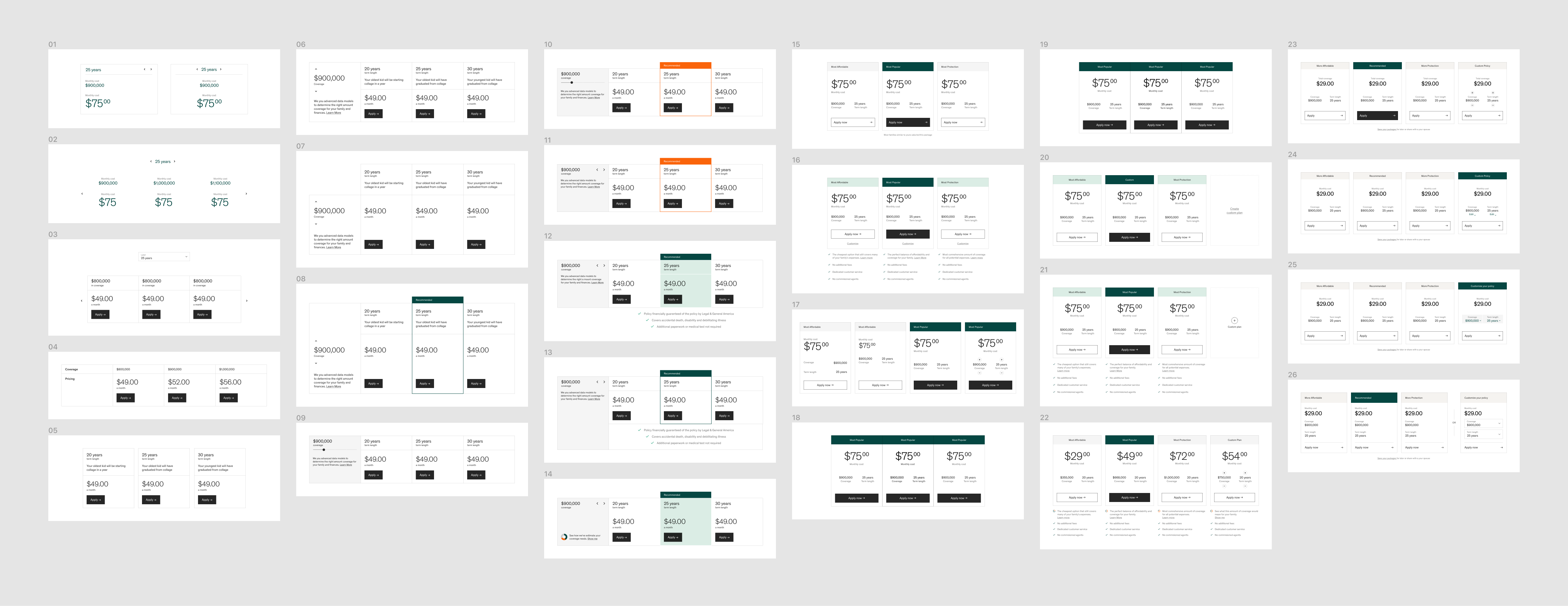 The brainstorm generated a variety of ideas, ranging from a sample policy from a fictional family to the ability to share quotes with others. With the goal of increasing conversion in mind, I narrowed down the list to the ideas that I felt best suited the package select page. From there, I worked with stakeholders to understand which concepts would create the most impact and tell a cohesive narrative. After determining the essence of the design, I iterated on each component to create a final recommendation that would satisfy user needs, functional needs, and business needs.