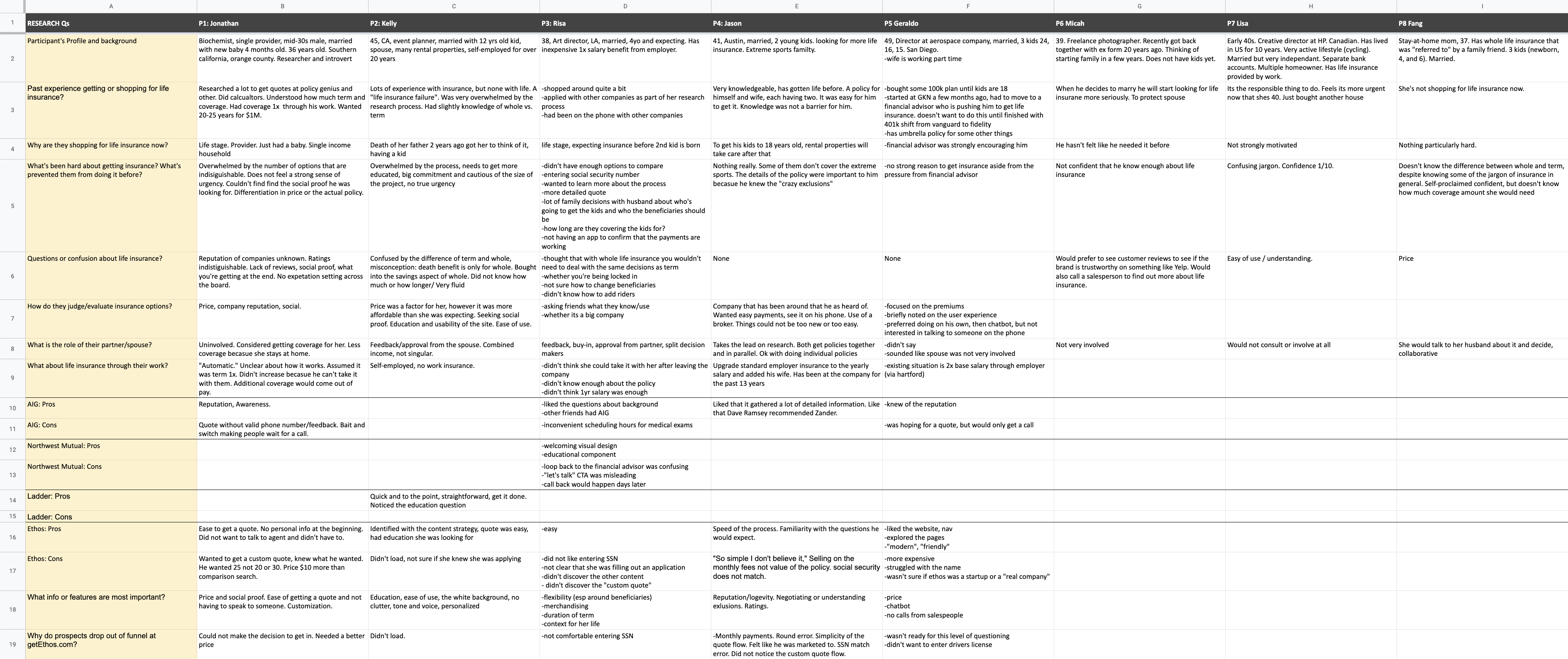 In collaboration with GV Research, our design team conducted a series of remote interview sessions with people who represented our core demographics. We were curious about what circumstances led to their need to shop for life insurance, and if they had purchased life insurance already, what their experiences were like. We walked participants through competitor product pages, as well as our own, to understand how the shopping experience for each matched the participants’ expectations. We learned that: