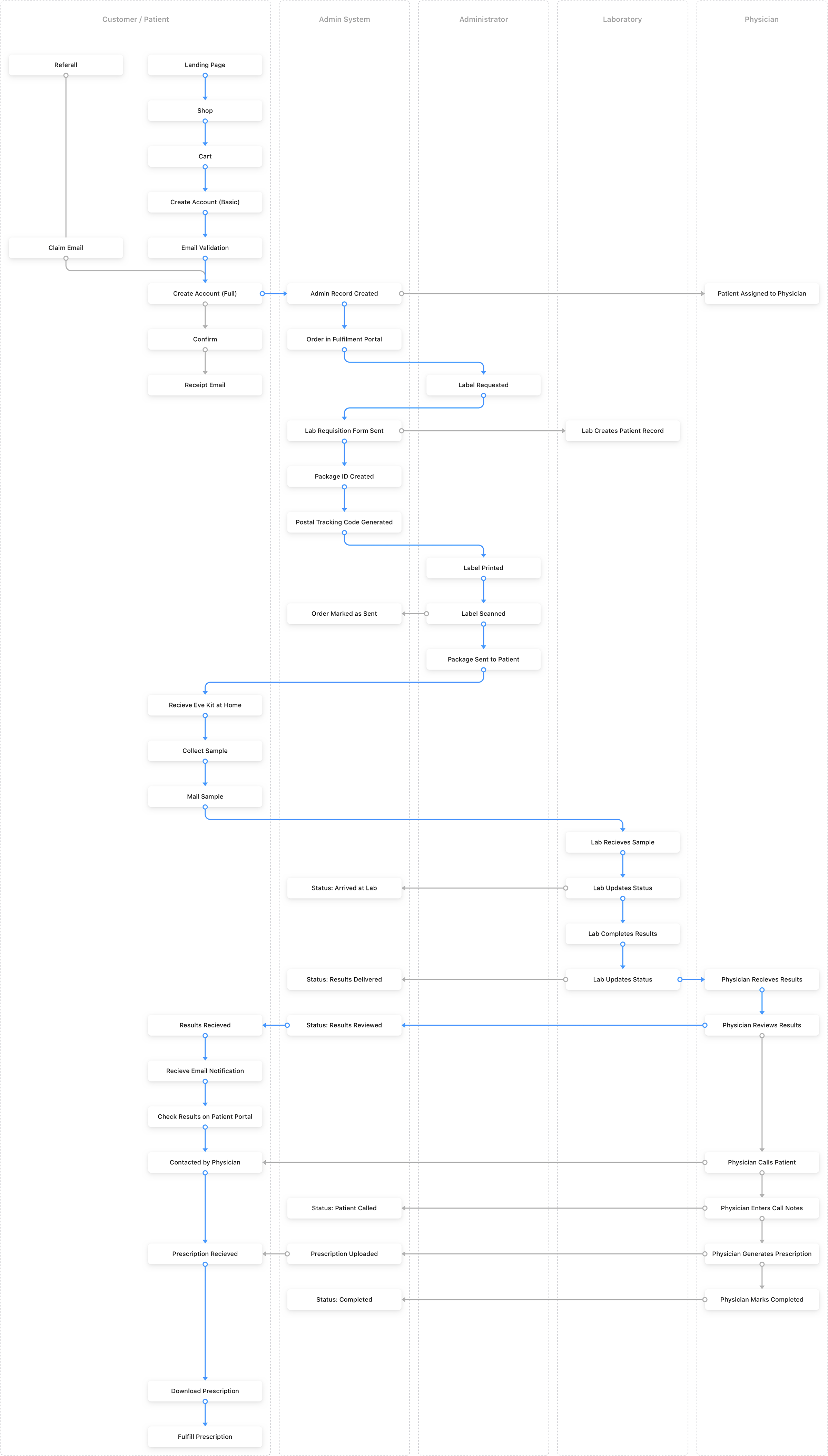 Eve Kit is an at home STI testing kit for women, that is a convenient alternative to the traditional health care system. Women are able to purchase an Eve Kit online or at a drugstore, collect a sample in the privacy of their own home, mail back the sample, and receive their results in just a few days. Throughout this process, each customer is personally looked after by a remote physician that ensures that they understand their results and receive the right aftercare. An important component throughout this process is the administrative and physician portal that is used to manage the end to end experience of each customer and patient.