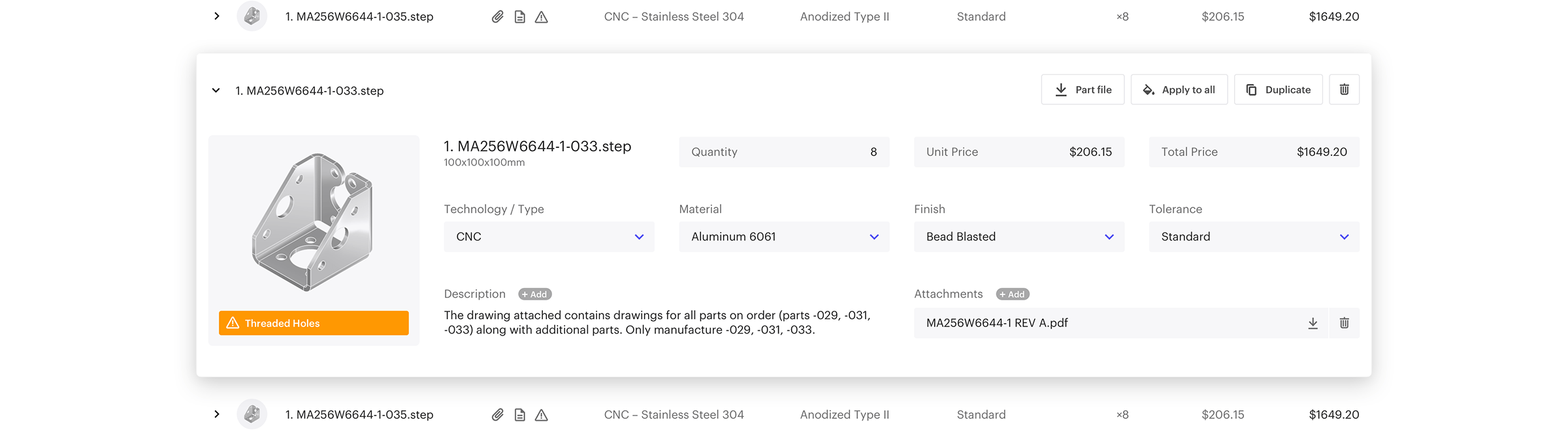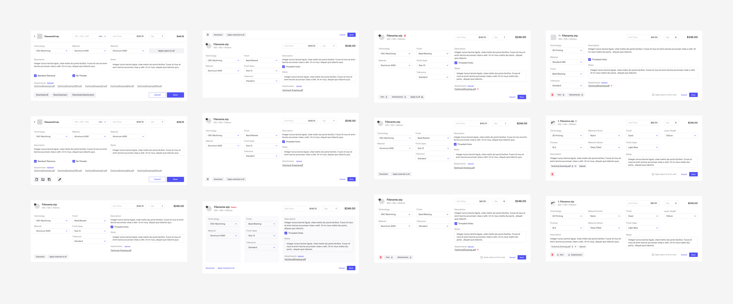 The second component that we addressed was the part and line items. We designed the line items and editing cards in such a way that they were easy to read despite the amount of information presented, and consistent regardless of what technology or combination of specifications were selected. In their static mode the line items neatly show the specification of the parts as well as indicate the additional details with a set off easily identifiable icons. We organized the details of a part into compact editing card that takes the place of a line item and allows the user to quickly modify they details without having to move around the screen. It was important to ensure that this component was as fast and seamless as possible, because of how frequently they would be interacting with it.